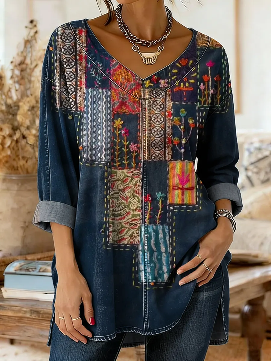 Women's Vintage Patchwork Pattern Art Print Casual V-neck Long-sleeved Washed Denim Shirt