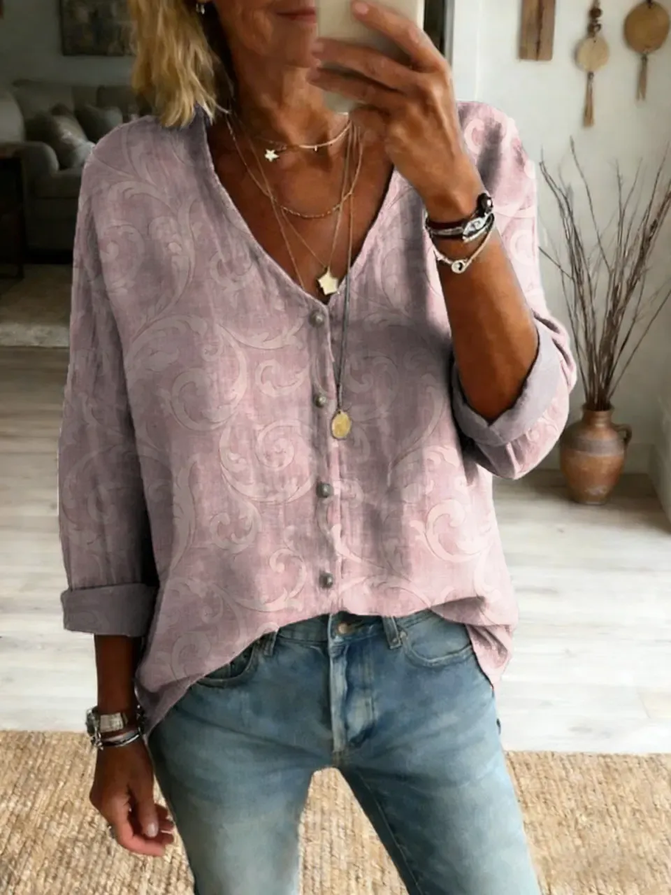 Women's Vintage Pink Floral Line Art Print Casual Linen V-Neck Shirt