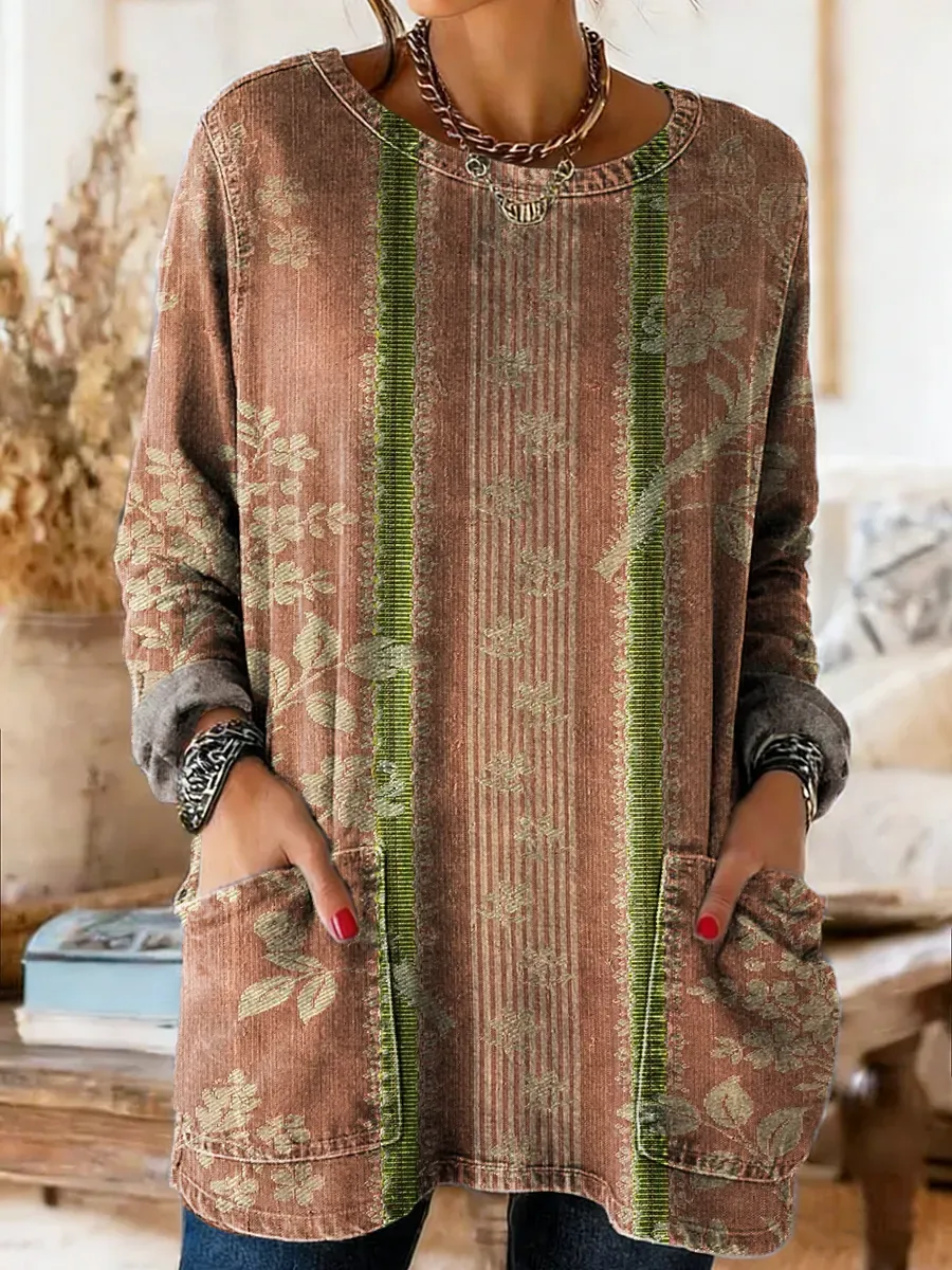 Women's Vintage Style Floral Art Print Casual Washed Denim Cotton Top