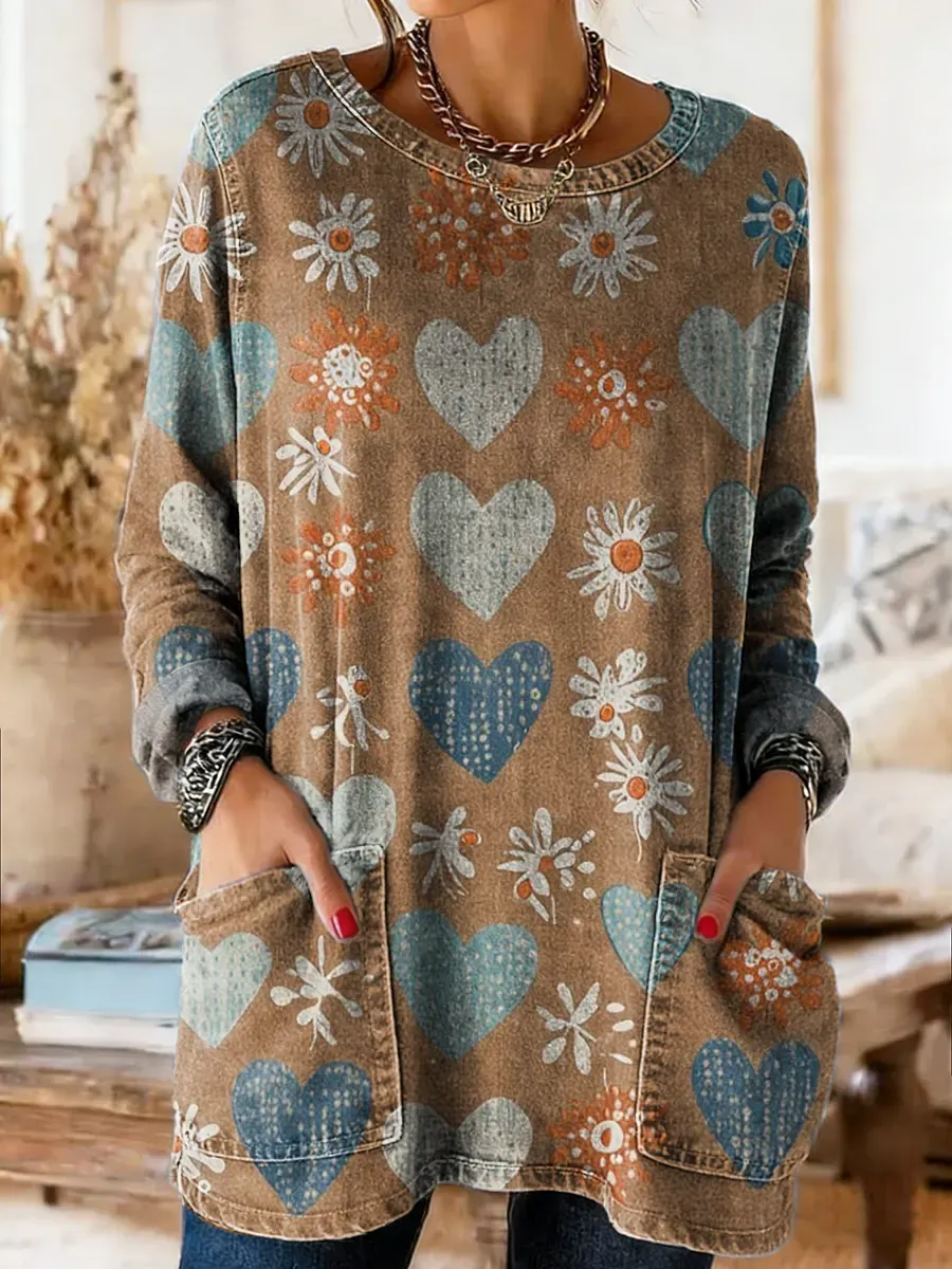Women's Vintage Style Heart Art Print Casual Washed Denim Cotton Top