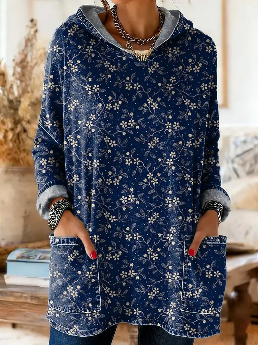 Ethnic Blue Flowers Women's Casual Pocket Hooded Washed Cotton Denim T-shirt
