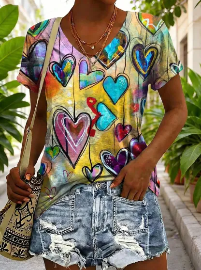 Ethnicity Doodle Love Women's V-neck Print Casual T-shirt