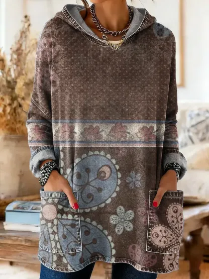 Ethnicity Patchwork Flowers Geometry Women's Casual Pocket Hooded Washed Cotton Denim T-shirt