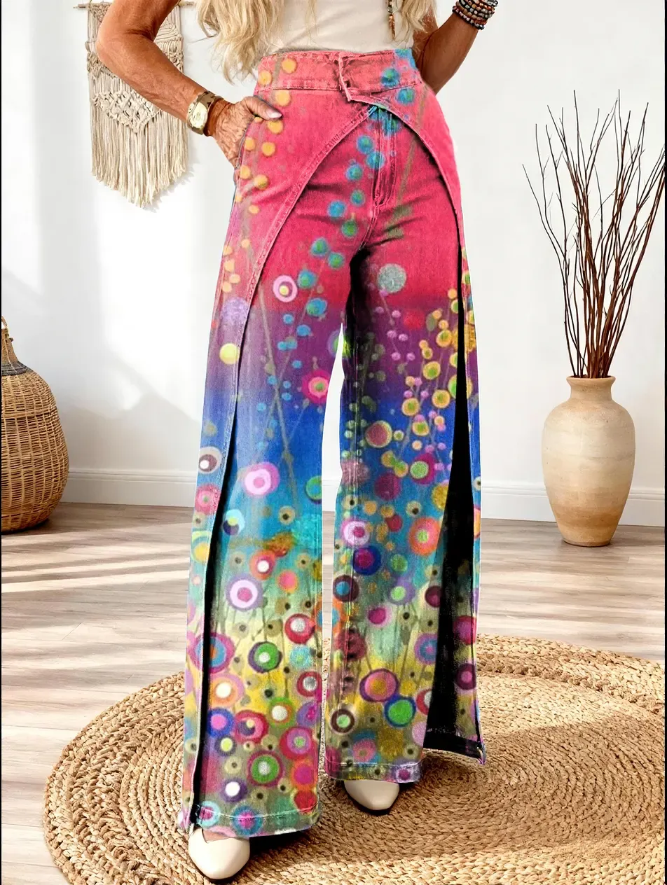 Women's Colorful Polka Dot Floral Art Print Casual Washed Cotton Denim Jeans