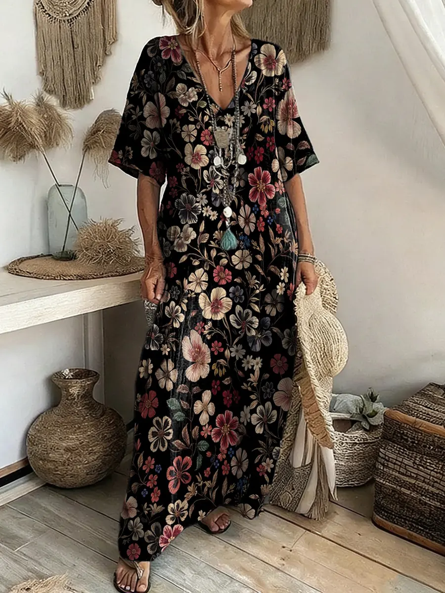 Women's Ethnic Floral Art Print V-Neck Short-Sleeve Cotton Pocket Dress