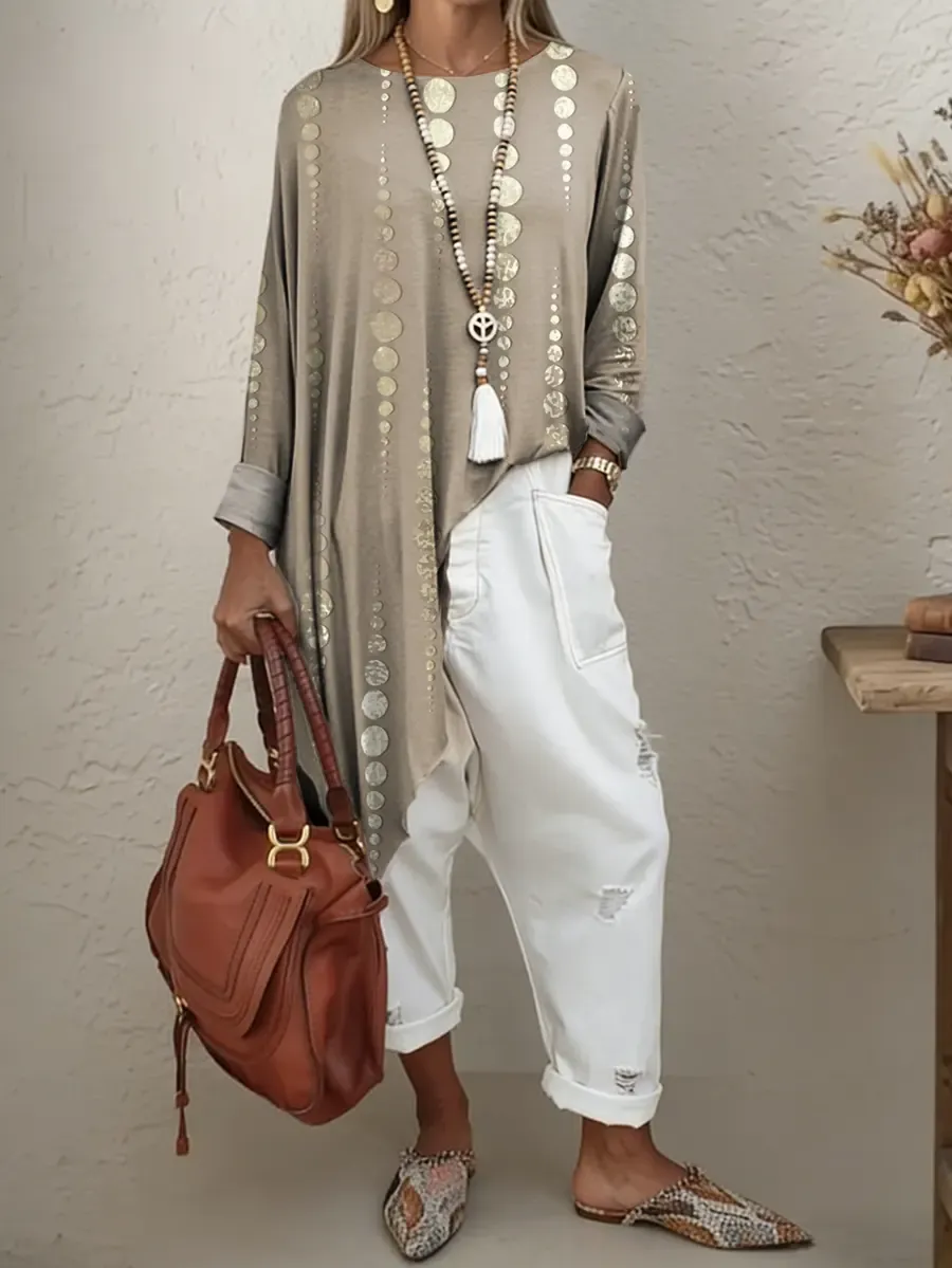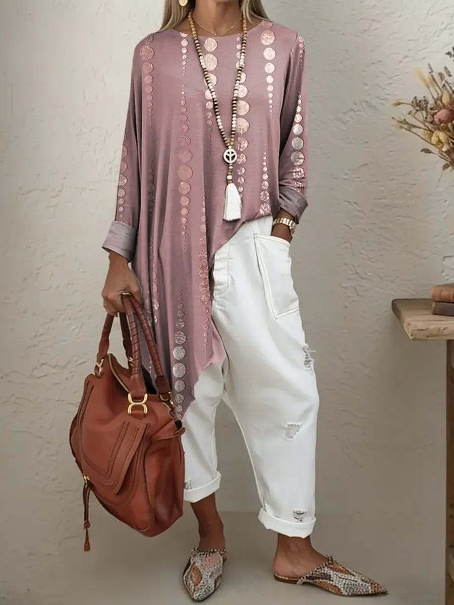 Women's Ethnic Polka Dots Art Print Irregular Hem Cotton Long-sleeve T-shirt