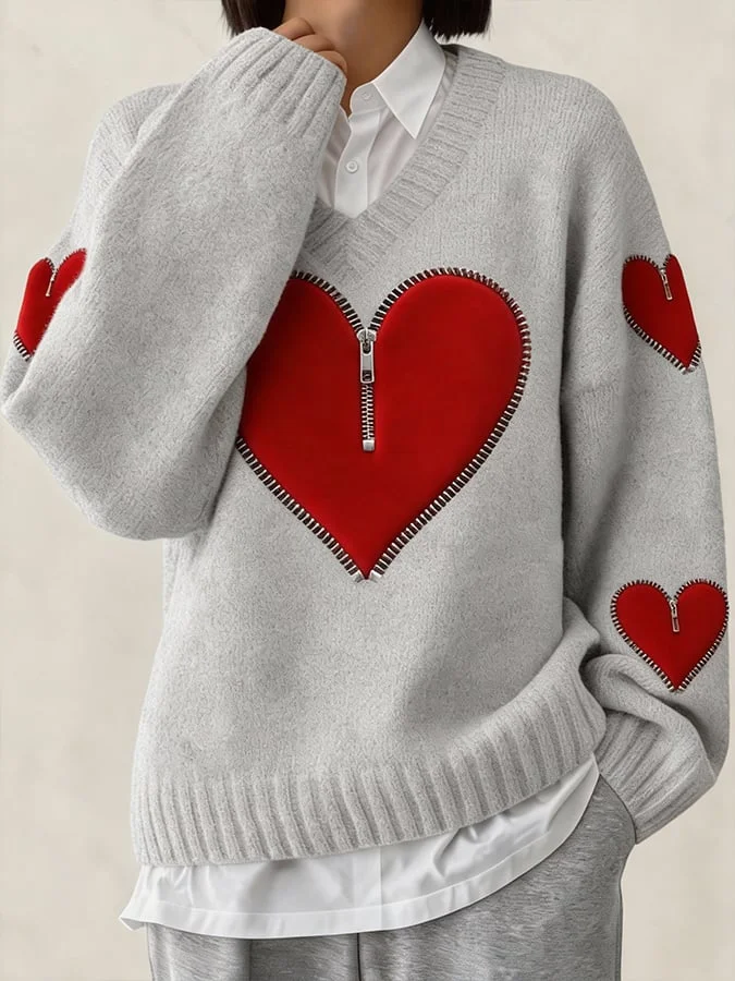 Women's Heart Print Comfortable V-Neck Knit Sweater