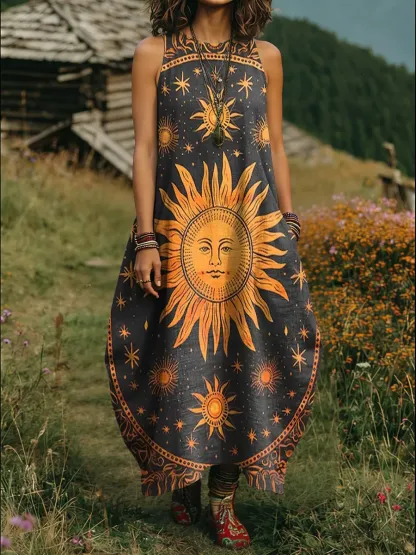 Women's Mysterious Sun Art Print Round Neck Sleeveless Cotton Pocket Dress