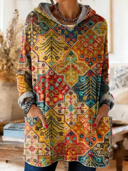 Women's Retro Bohemian Ethnic Art Print Casual Long-Sleeve Hooded Pocket Washed Cotton Denim T-Shirt