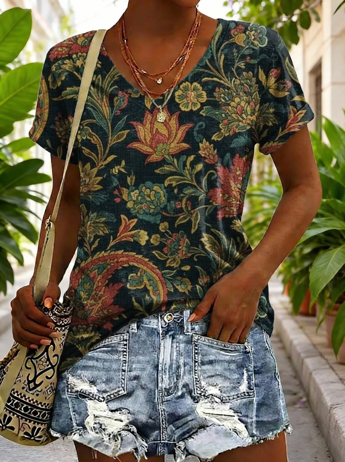Women's Retro Bohemian Floral Art Print Casual Short-Sleeve V-Neck Cotton T-Shirt