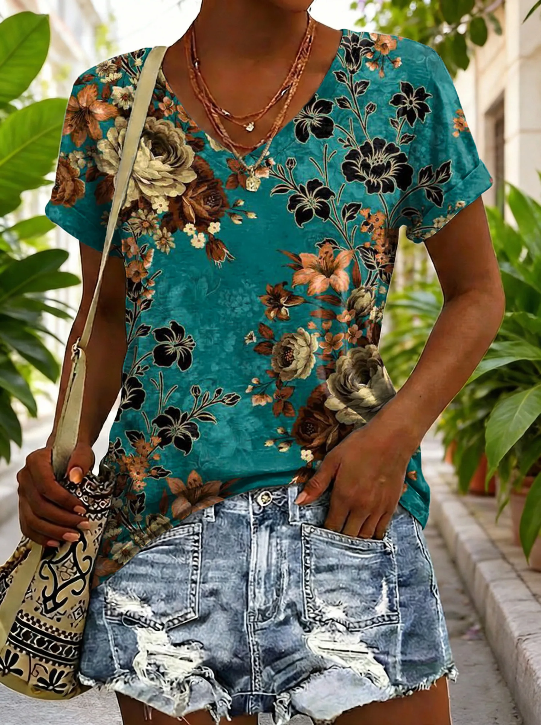 Women's Retro Bohemian Floral Art Print Casual Short-Sleeve V-Neck Cotton T-Shirt