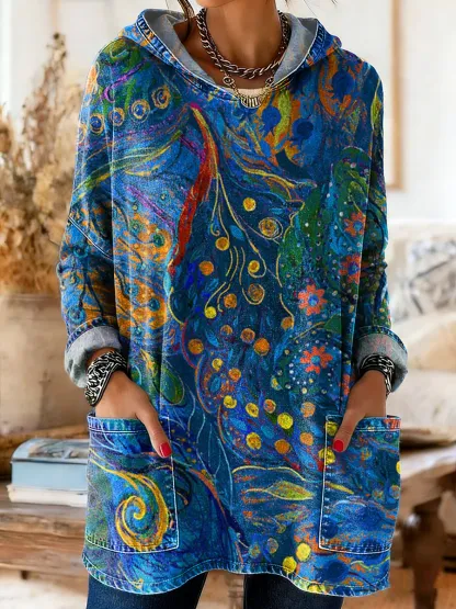 Women's Retro Colorful Art Print Casual Long Sleeve Hooded Pocket Washed Cotton Denim T-Shirt