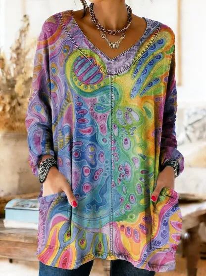 Women's Retro Colorful Art Print Casual Long Sleeve V-Neck Washed Cotton Denim T-Shirt