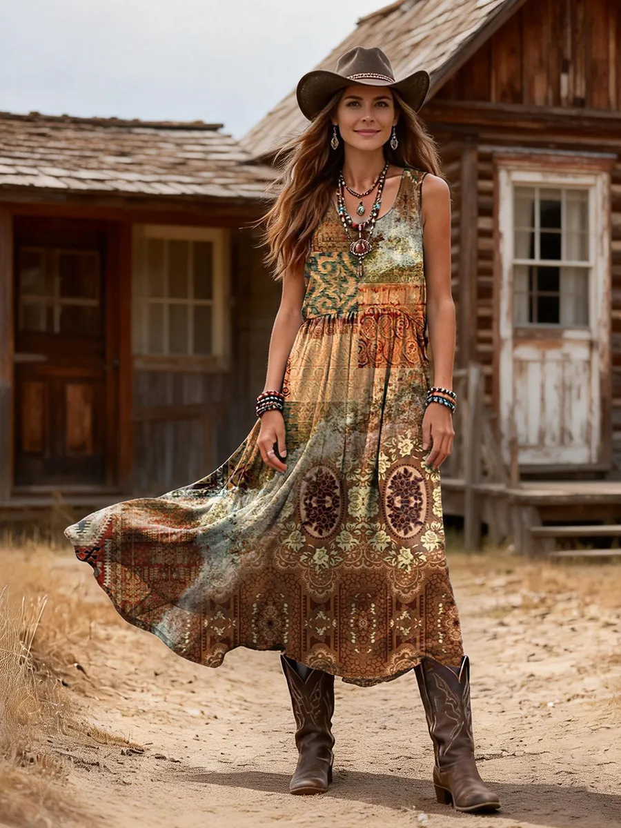 Women's Retro Colorful Ethnic Art Print Casual Sleeveless Round Neck Cotton Dress