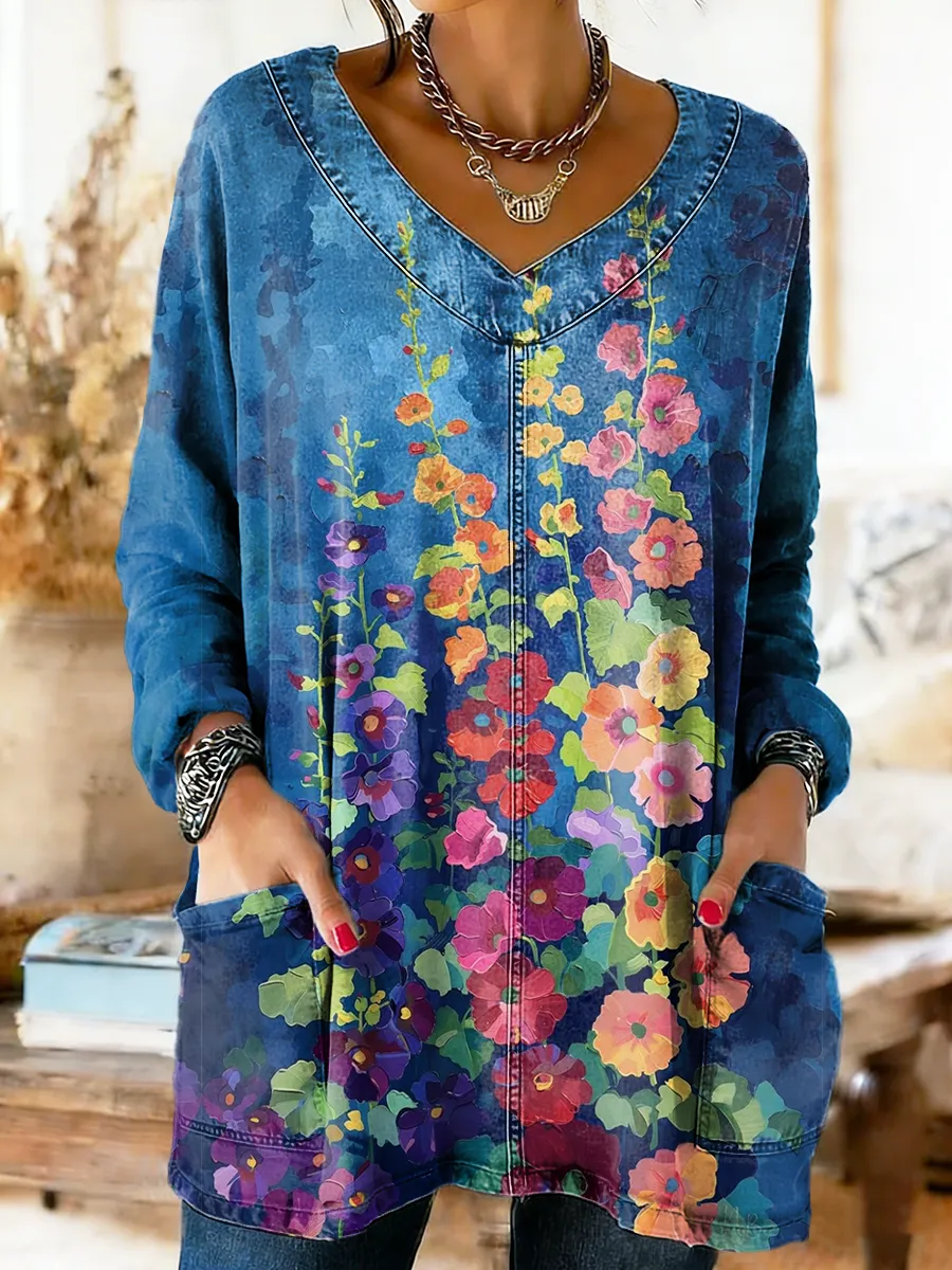 Women's Retro Floral Art Print Casual Long-Sleeve V-Neck Washed Cotton Denim T-Shirt