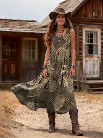 Women's Retro Floral Art Print Casual Sleeveless Round Neck Cotton Dress