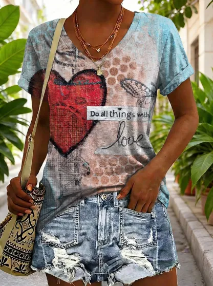 Women's Retro Heart Art Print Casual Short-Sleeve V-Neck Cotton T-Shirt