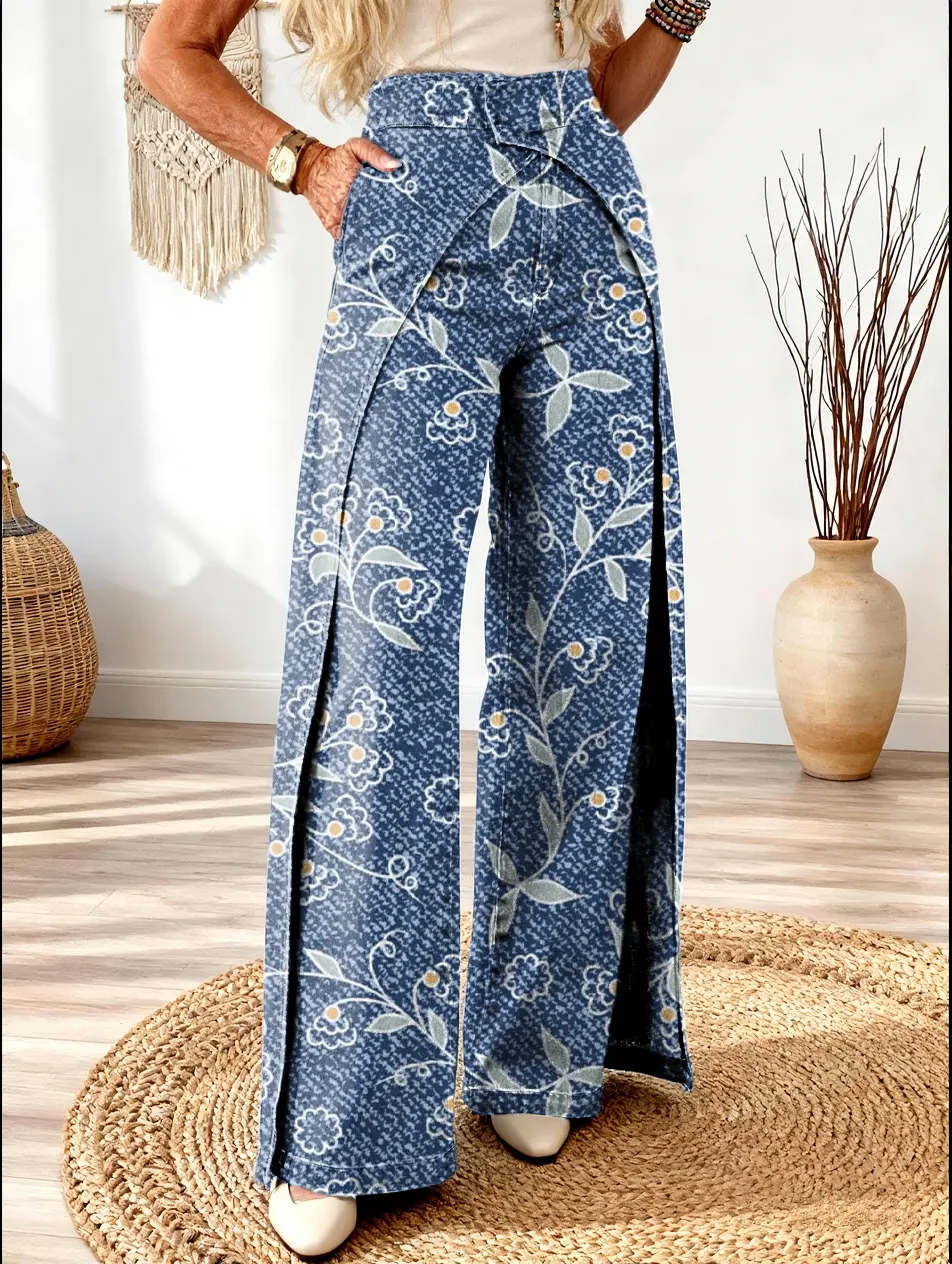 Women's Textured Vintage Floral Pattern Art Print Casual Washed Cotton Denim Jeans