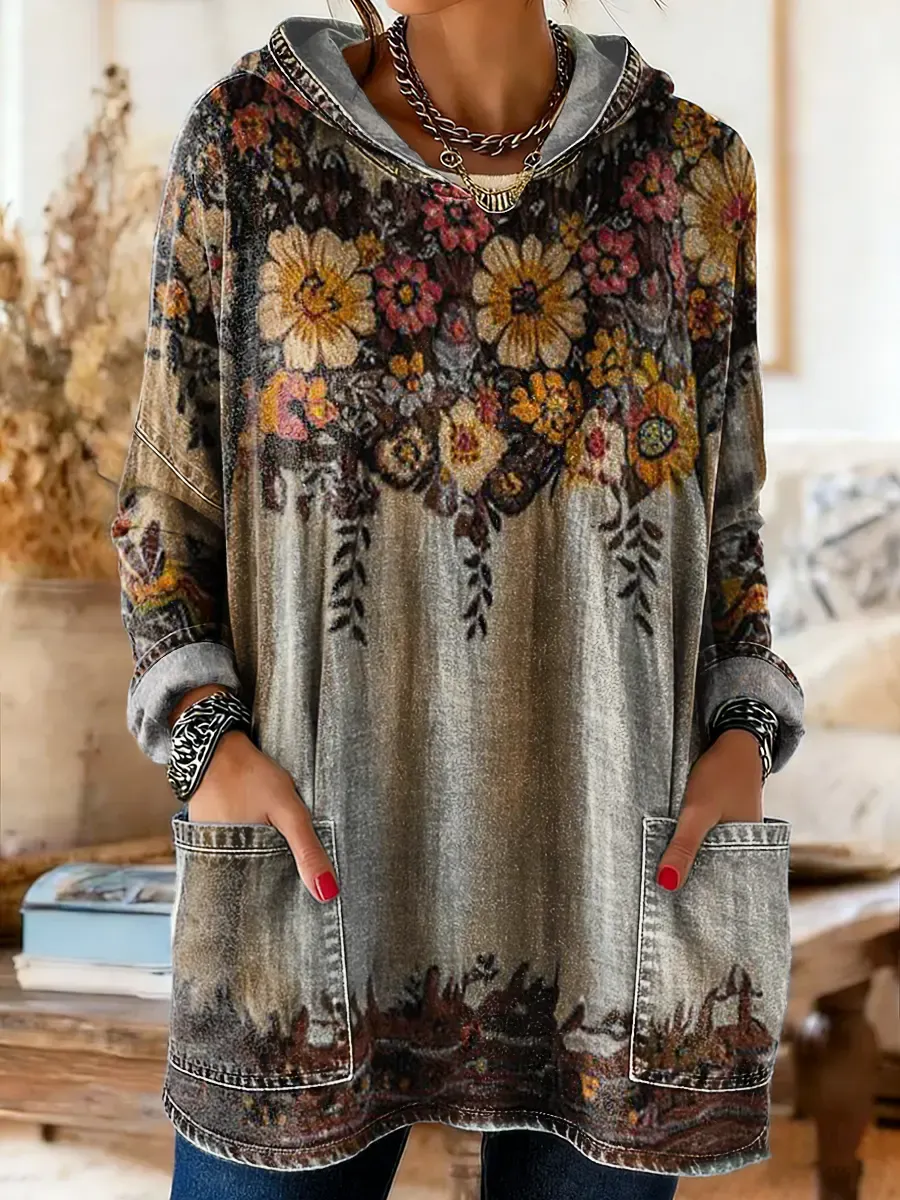 Women's Vintage Ethnic Floral Pattern Art Print Hooded Long Sleeve With Pockets