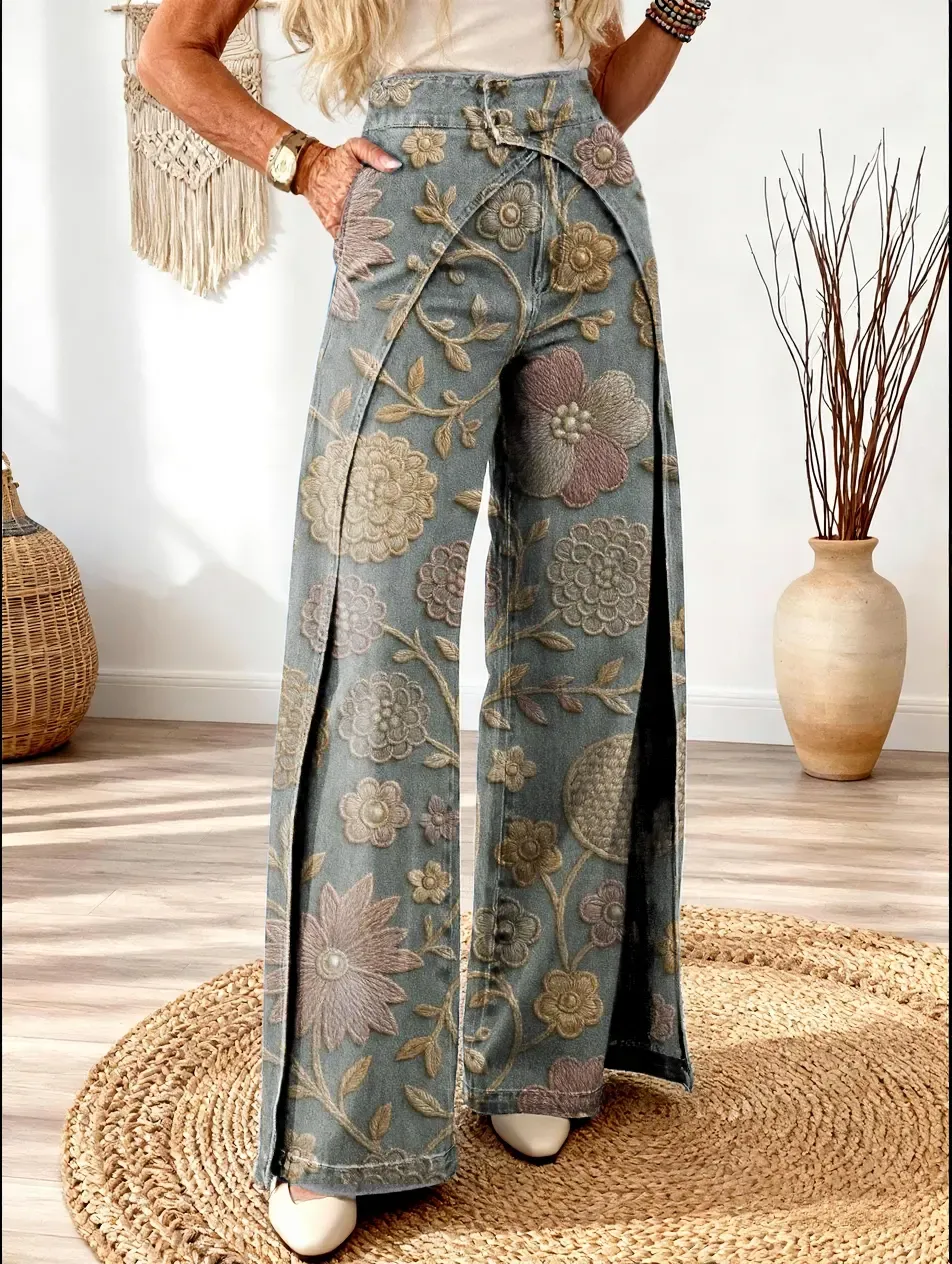 Women's Vintage Floral Textured Pattern Art Print Casual Washed Cotton Denim Jeans