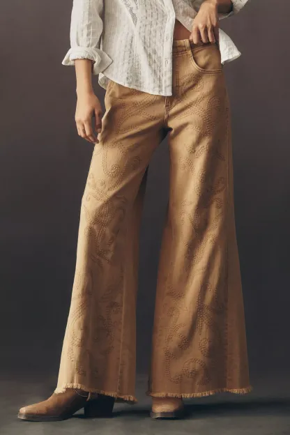 Women's Vintage Patterned Printed Loose Casual Shredded Washed Denim Wide Leg Pants