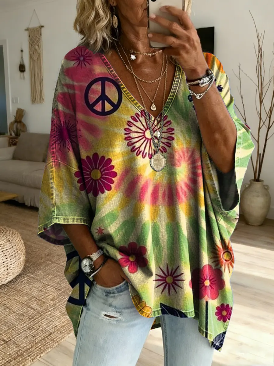 Hippie Flowers Tie Dye Women's Art Print Casual Washed Cotton Denim Top
