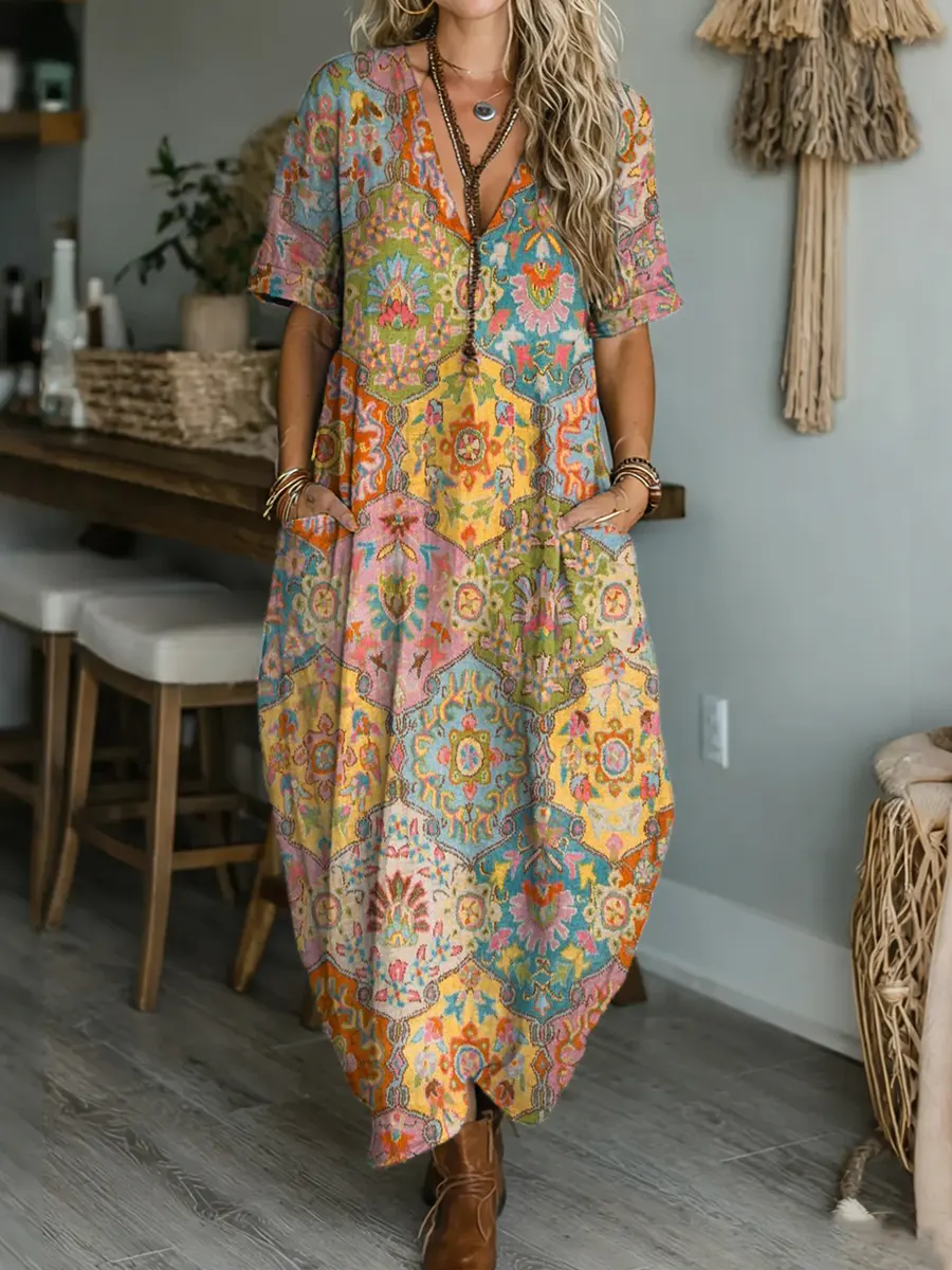 Women's Ethnic Totem Art Pattern Prints V-neck Short-sleeve Cotton Pocket Dress