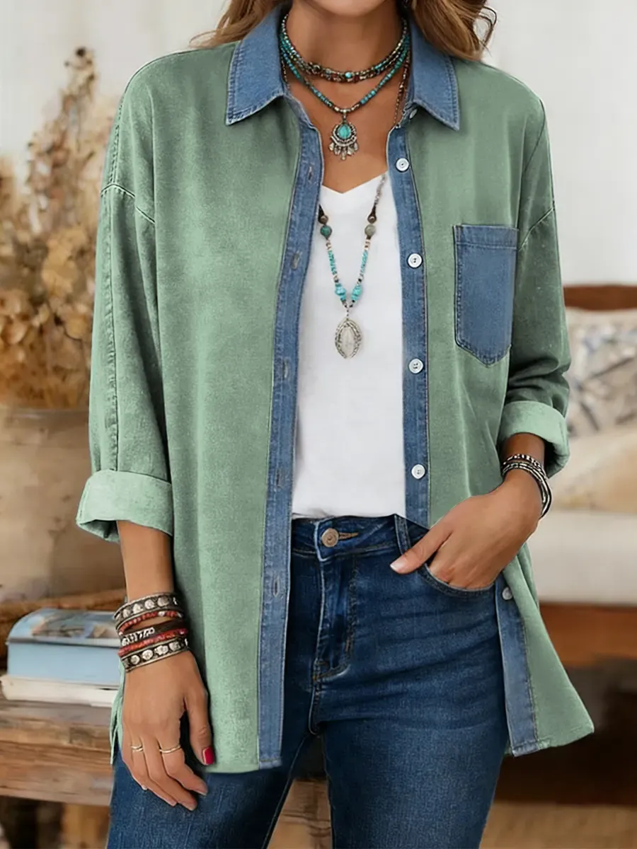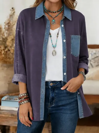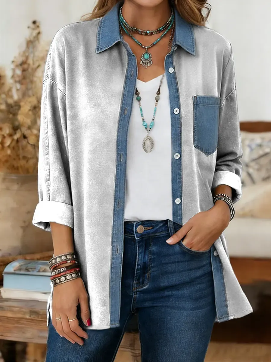 Women's Print Casual Denim Patchwork Cotton Shirt