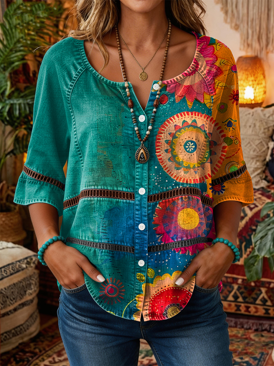 Women's Retro Ethnic Floral Art Print Casual Round Neck Hollow-out Washed Cotton Denim Cardigan Shirt