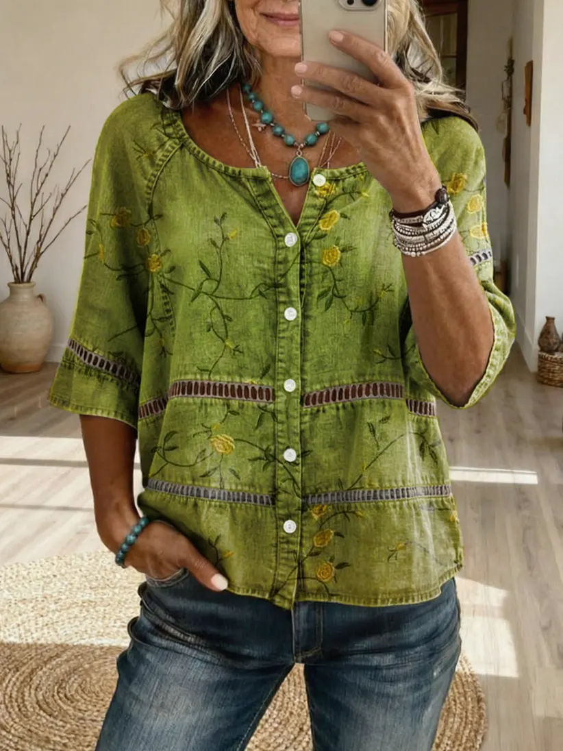 Women's Retro Green Floral Art Print Casual Crew Neck Cutout Top
