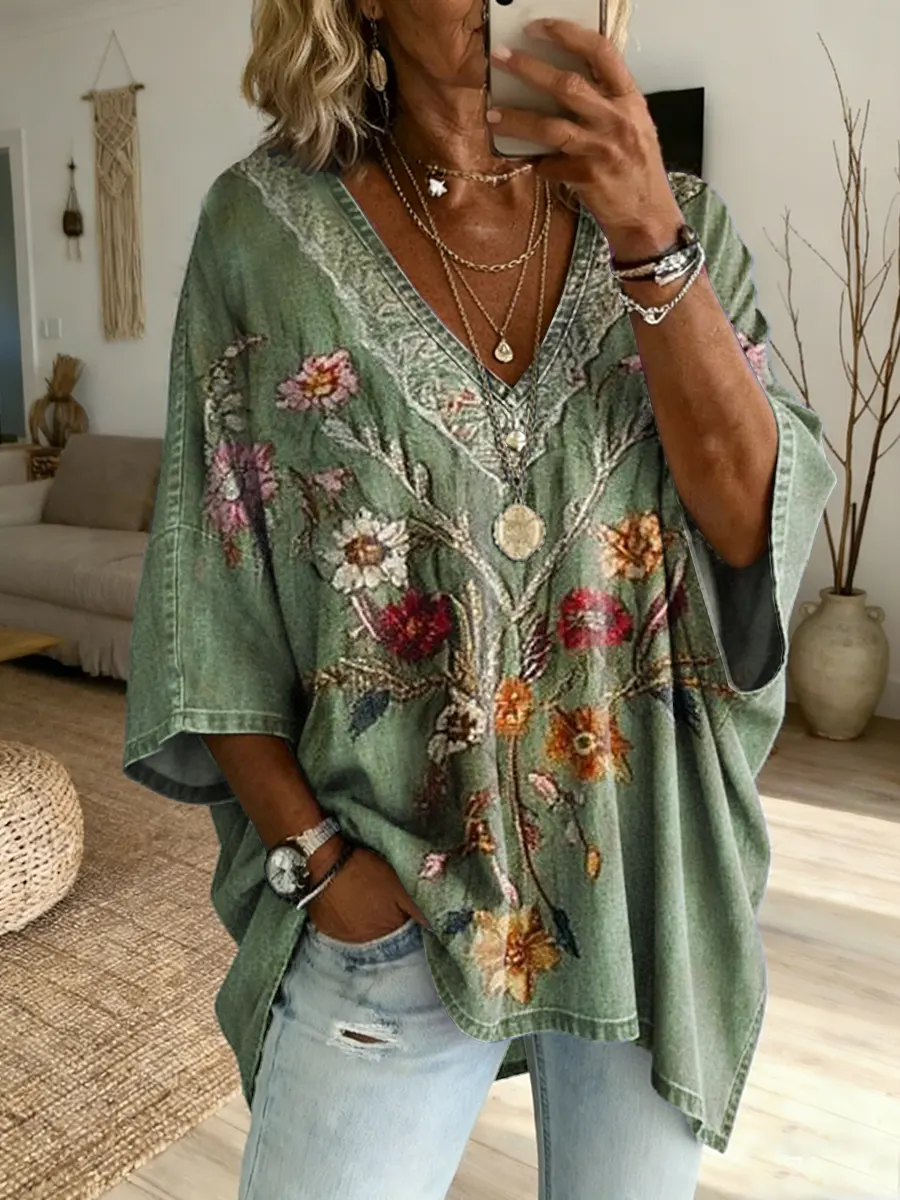 Women's Vintage Floral Art Print V-Neck Loose-Fit Denim Top