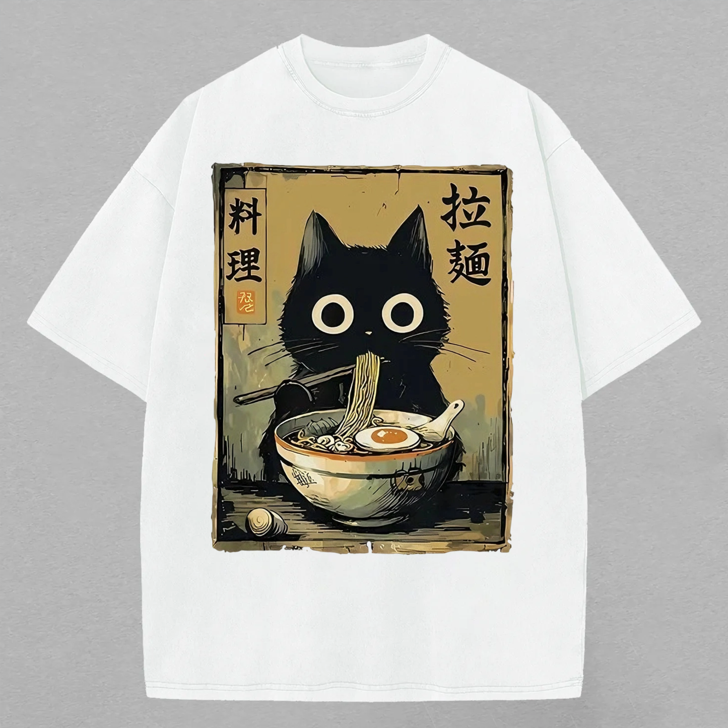 Cute Black Cat Ramen Japan Printed Oversized T-shirt