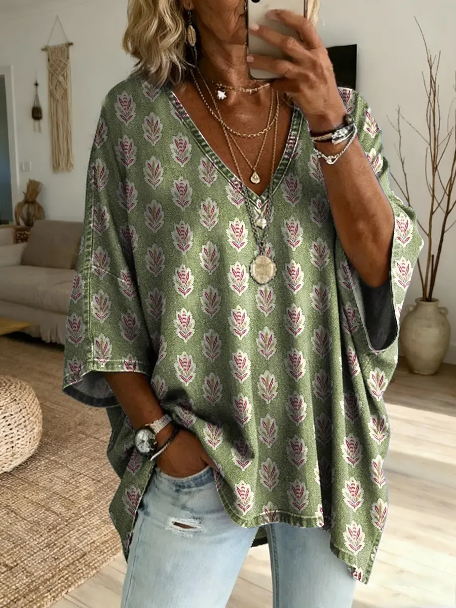 Ethnic Flowers Women's Art Print Casual Washed Cotton Denim Top