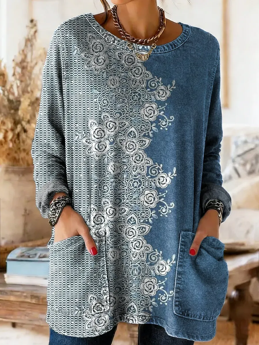 Ethnicity Geometry Totem Flowers Women's Casual Long-sleeve Crew Neck Pocket Washed Cotton Denim T-shirt