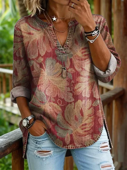 Ethnicity Retro Red Flowers Women's Art Print Casual V-neck Washed Cotton Denim Top