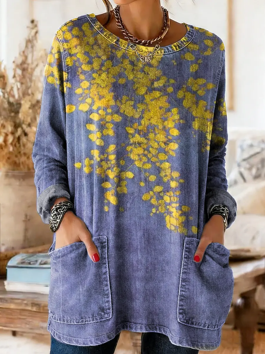 Ethnicity Yellow Flowers Women's Casual Long-sleeve Crew Neck Pocket Washed Cotton Denim T-shirt