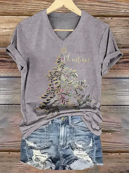Retro Merry Christmas Christmas Tree V-neck Casual T-shirt