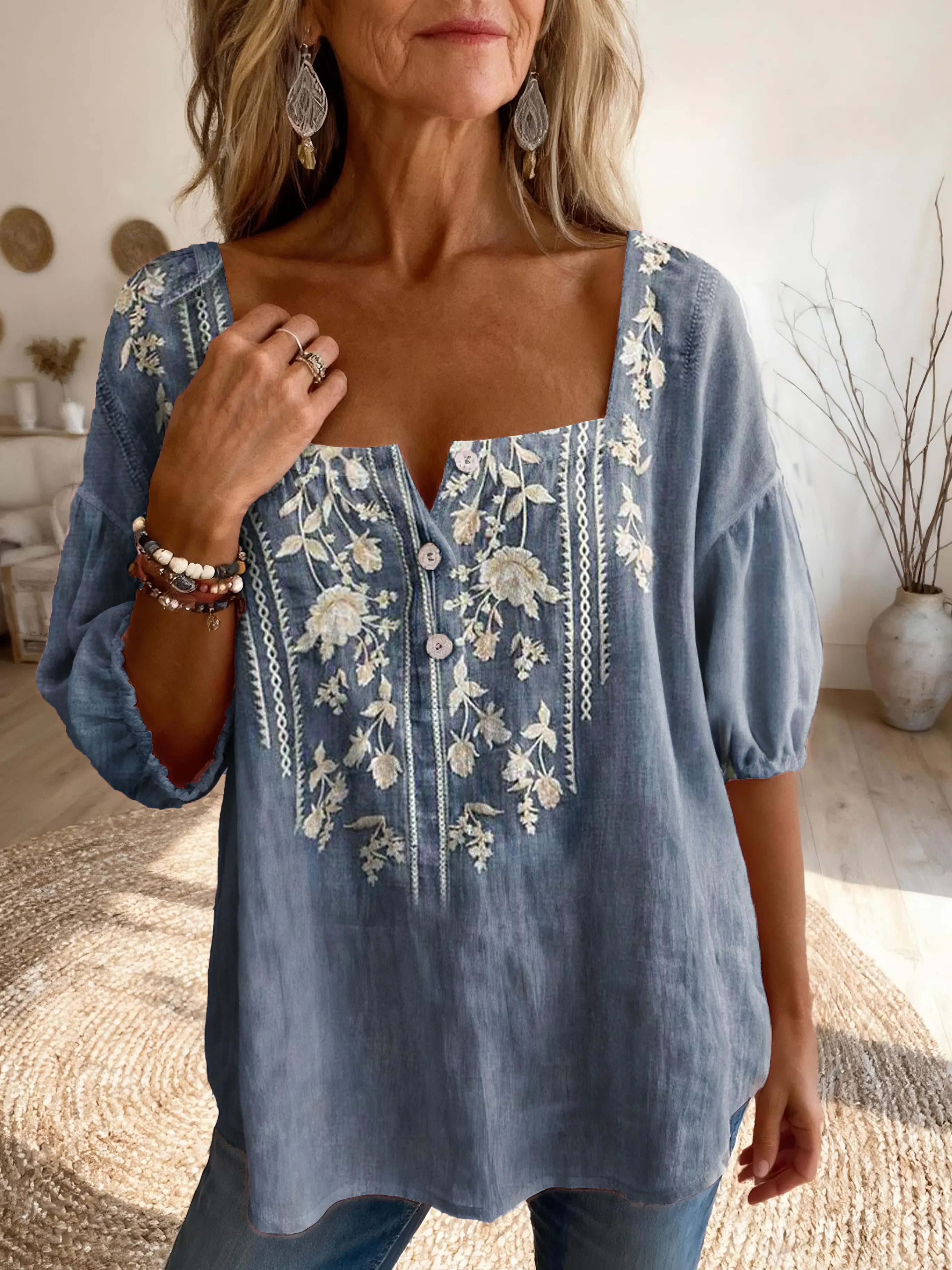 Women's Bohemian Style Ethnic Floral Art Print Casual Square Neck Top