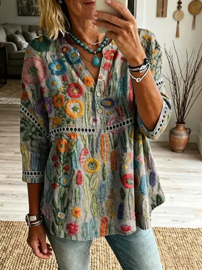 Women's Bohemian Textured Floral Art Print Casual V-Neck Cutout Top