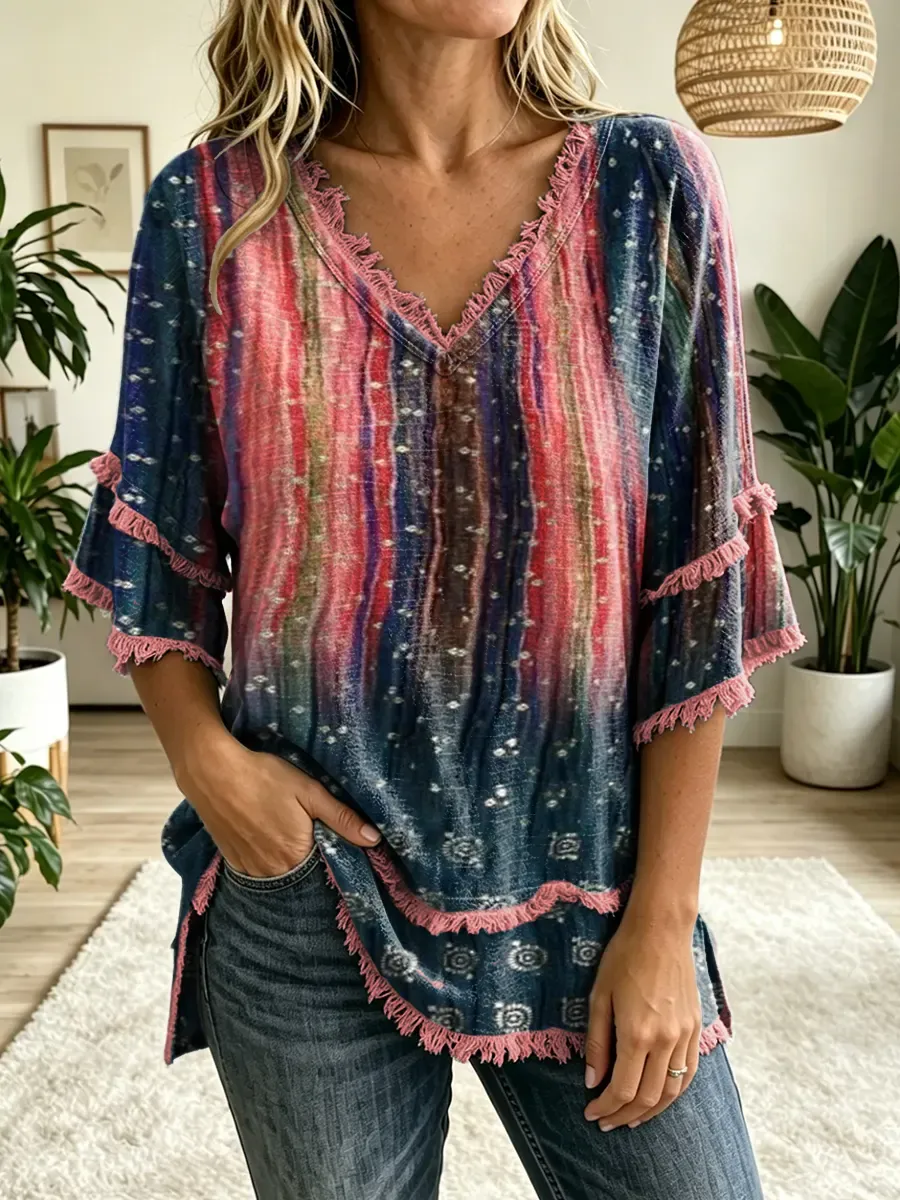 Women's Folk Art Print V-Neck Tasseled Cotton Top