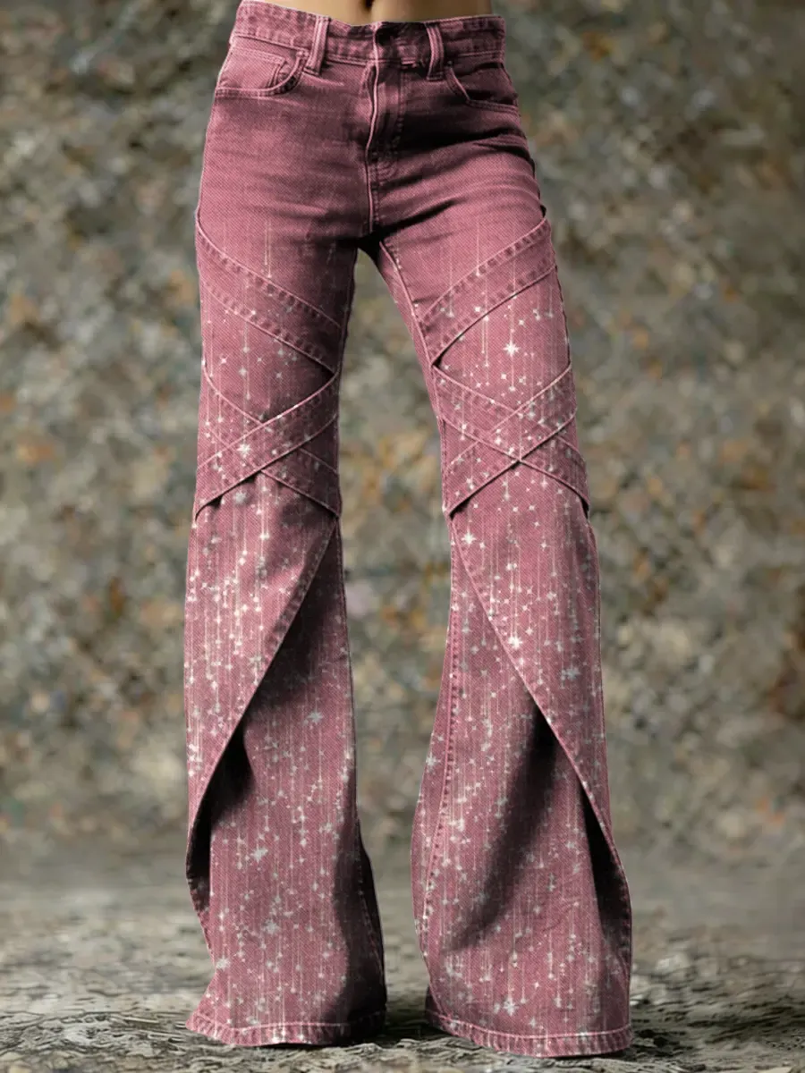 Women's Glitter Art Print Washed Cotton Ruffled Denim Jeans