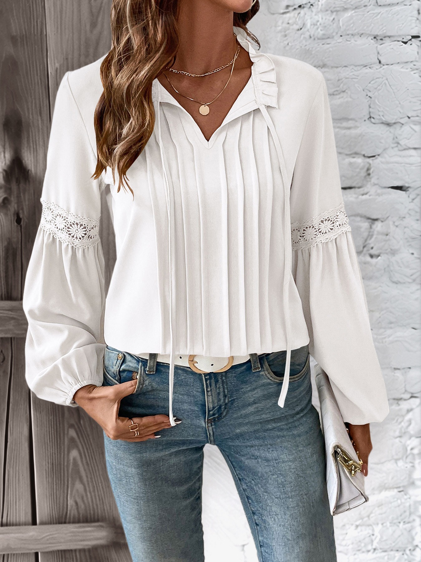 Women's Lace V-neck Solid Color Pleated Long-Sleeve Shirt