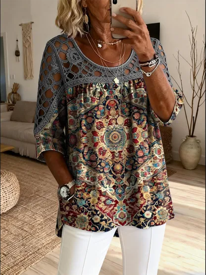 Women's Retro Ethnic Art Print Casual Three-quarter Sleeve Round Neck Hollow-out Top