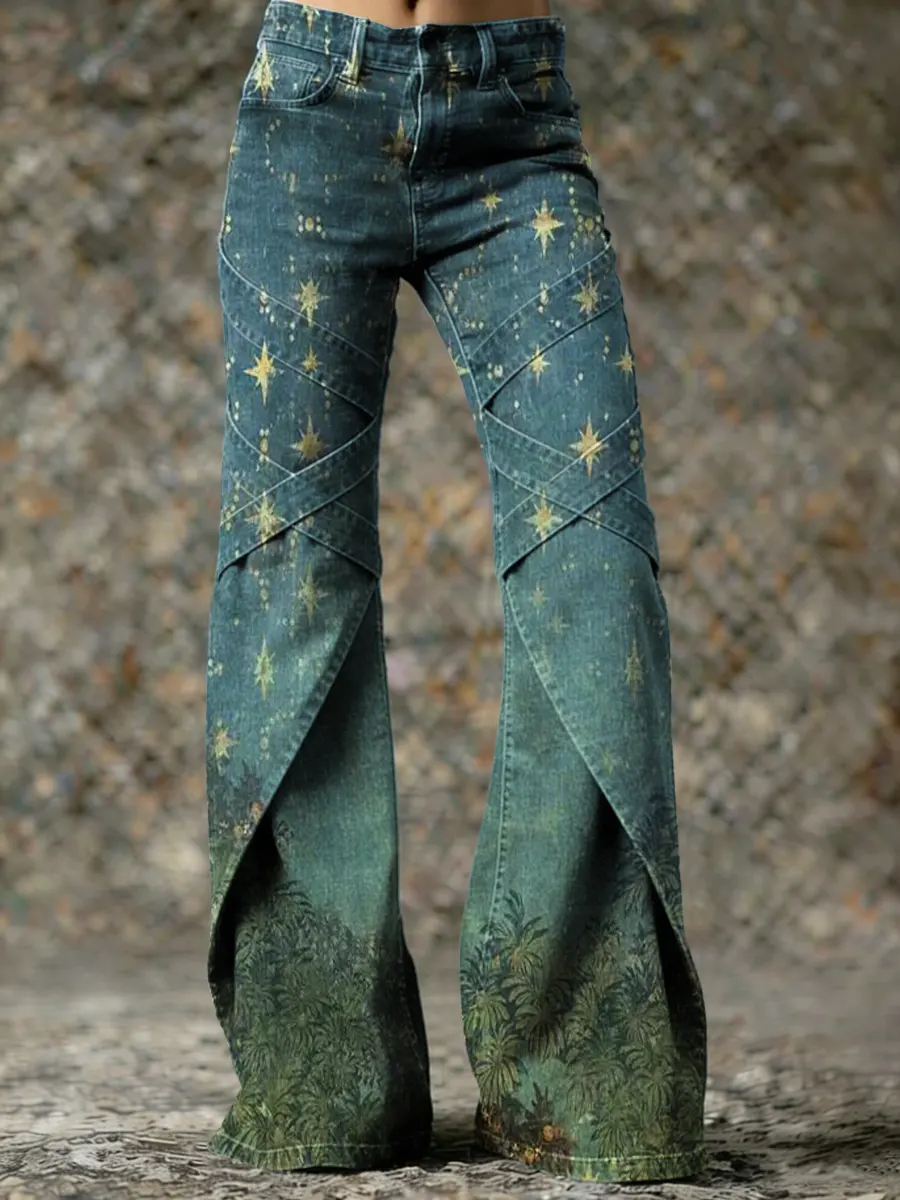 Women's Star Flower Print Washed Cotton Ruffled Denim Jeans