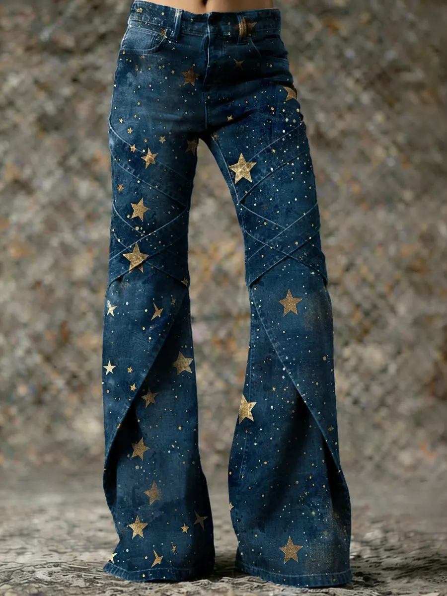 Women's Star Print Washed Cotton Ruffled Denim Jeans