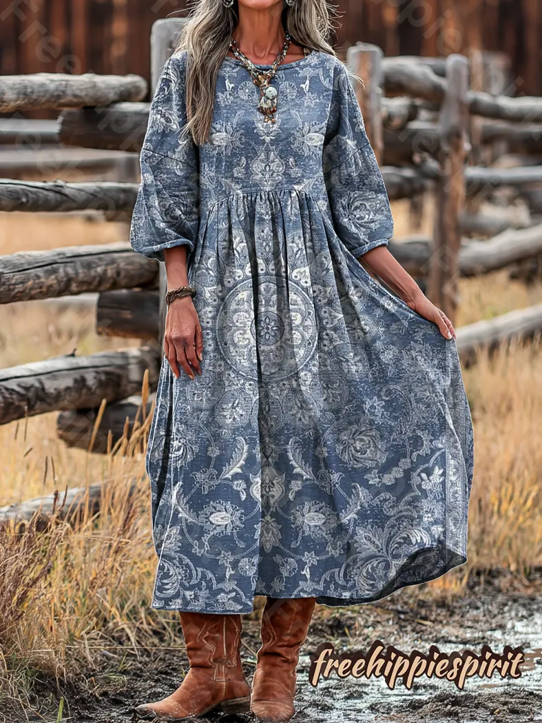 Women's Vintage Ethnic Blue Floral Totem Art Print Flowing Elegant Cotton Crew Neck Dress
