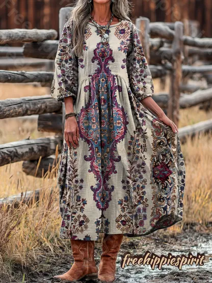 Women's Vintage Ethnic Floral Totem Art Print Flowing Elegant Cotton Crew Neck Dress