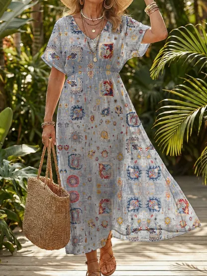 Women's Vintage Ethnic Gray Patterned Art Printed Casual Vacation V-neck Short Sleeve Dresses