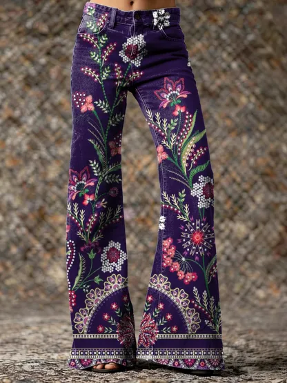 Women's Vintage Ethnic Purple Floral Art Prints Casual Denim Flared Pants