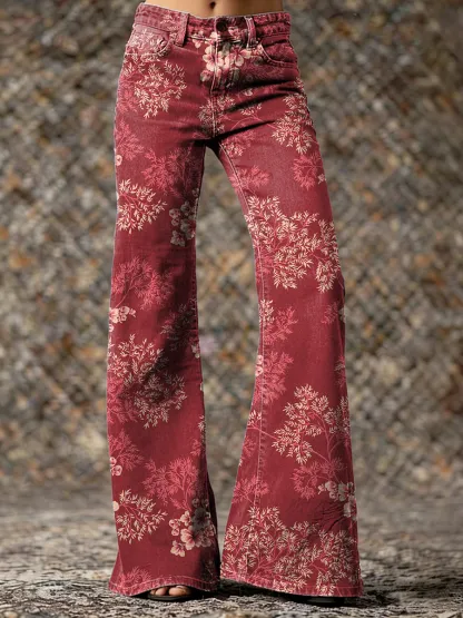 Women's Vintage Ethnic Red Floral Art Prints Casual Denim Flared Pants